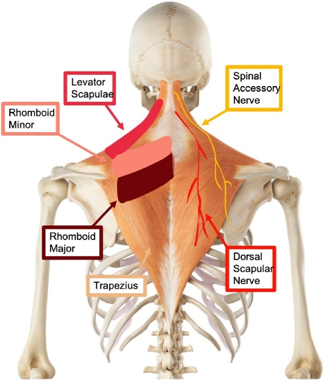 The dorsal scapular nerve. It travels along the inner border of the shoulder blade and often causes that sharp ache or “crick” near the neck and upper back.